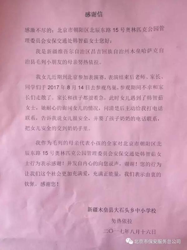 原來,努熱依拉女士的女兒毛列8月14日在鳥巢游玩期間與家長走散,找不到親人的小女孩遇到了正在執(zhí)勤的韓智茹,她積極幫助孩子聯(lián)系到家人,并一直將孩子送到一公里外的科技館,交給孩子的奶奶。