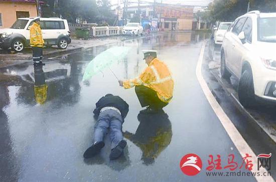 馬路上車來(lái)車往,躺在路上太危險(xiǎn)了。于是,李浩罡、曾華崗試圖叫醒醉酒男子,但該男子毫無(wú)反應(yīng)。出于安全考慮,其中一人蹲下給躺在地上的醉酒男子撐起雨傘(如圖),另一人向公安派出所匯報(bào)。李浩罡和曾華崗直到民警趕到,把醉酒男子抬上警車,才回到崗位上繼續(xù)執(zhí)勤。