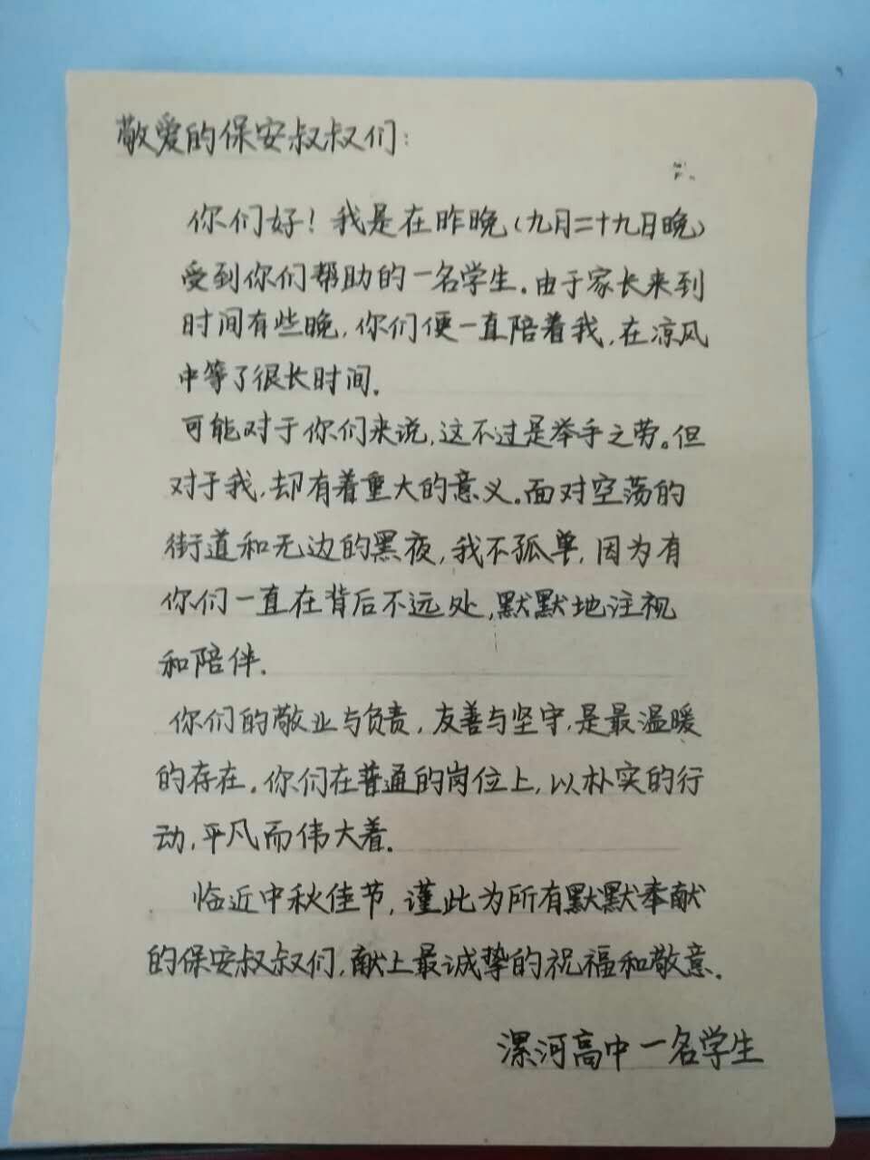 一封來自高中生寫給漯河金盾保安大叔的感謝信