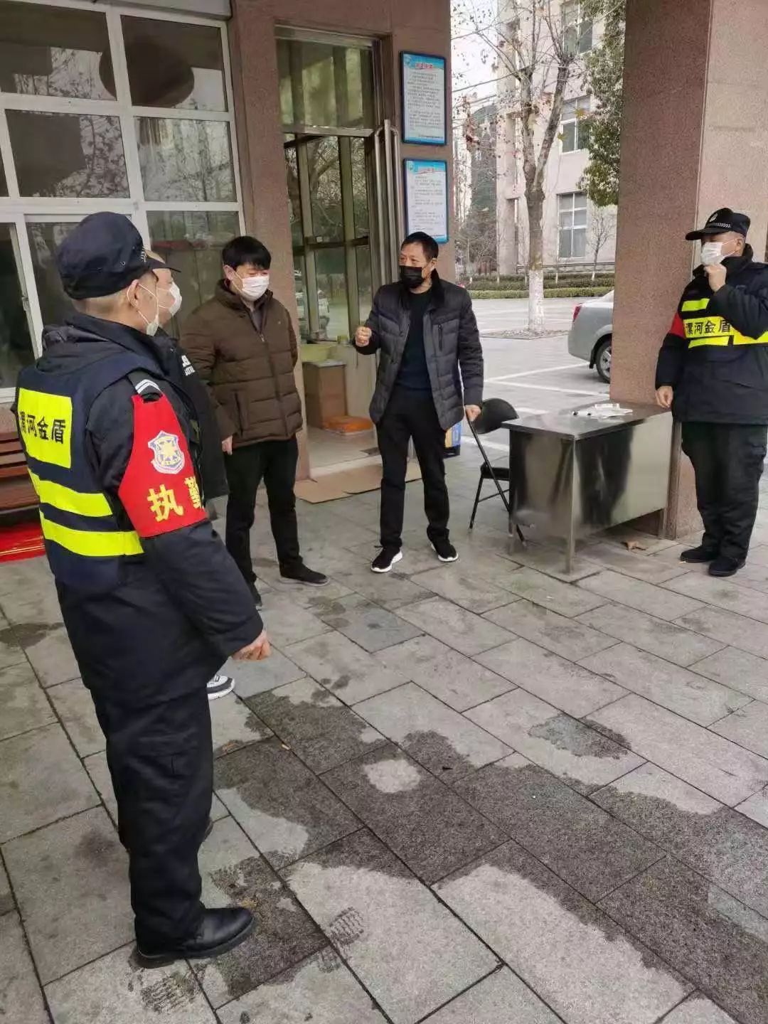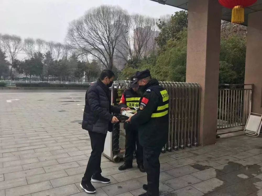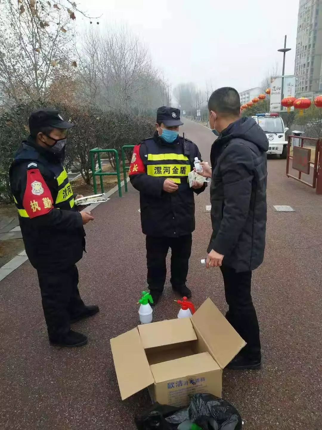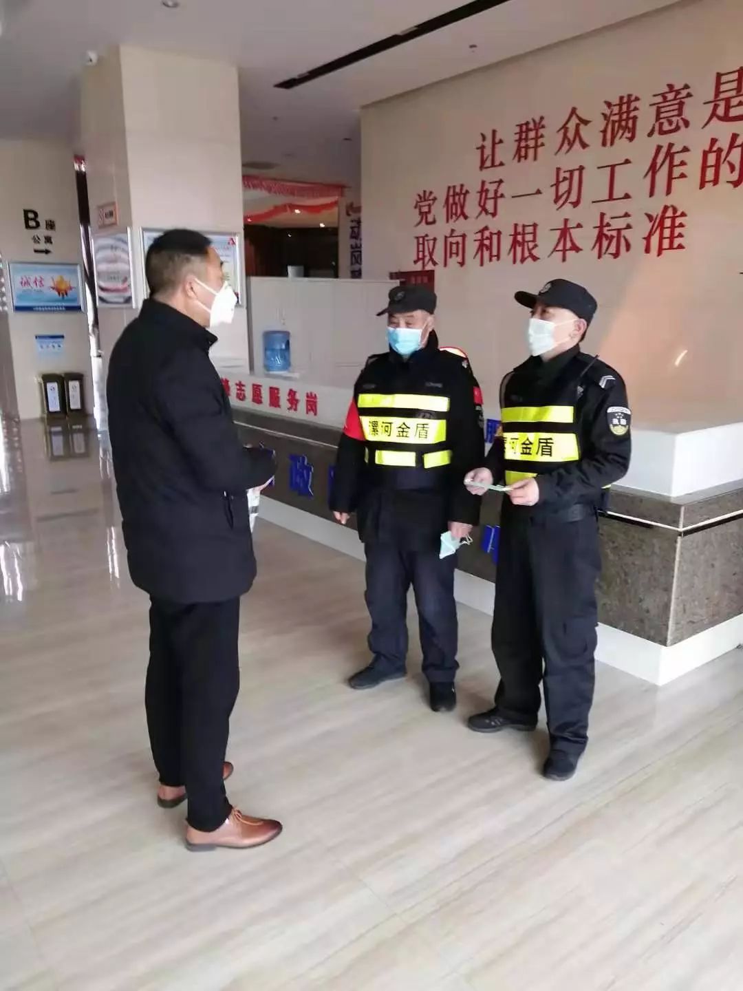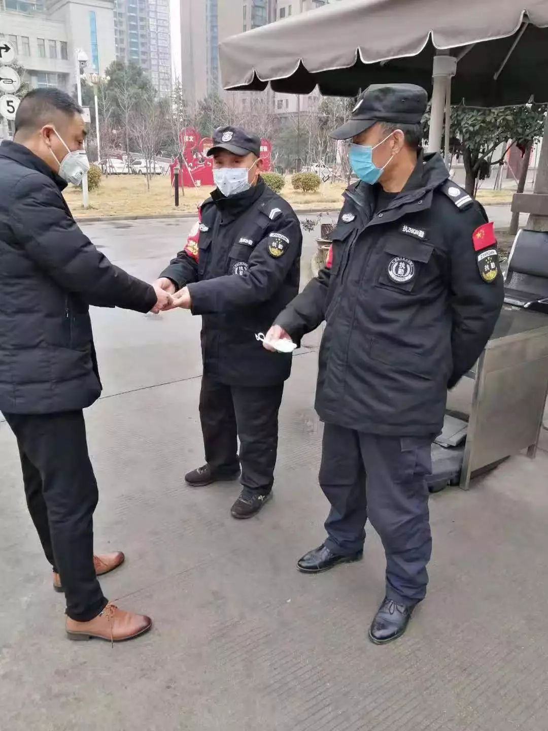 2020年1月27日(農(nóng)歷大年初三)上午,漯河市金盾保安服務(wù)有限公司總經(jīng)理?xiàng)瞰I(xiàn)軍、副總經(jīng)理吳清旺、劉文太、王建波、海永軍等領(lǐng)導(dǎo)班子分別帶隊檢查節(jié)日安保和疫情防控工作,看望慰問各個崗點(diǎn)值班人員,對節(jié)日期間奮戰(zhàn)在一線的人員送去了節(jié)日的祝福及口罩、酒精等疫情防治物品。