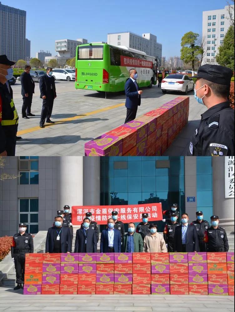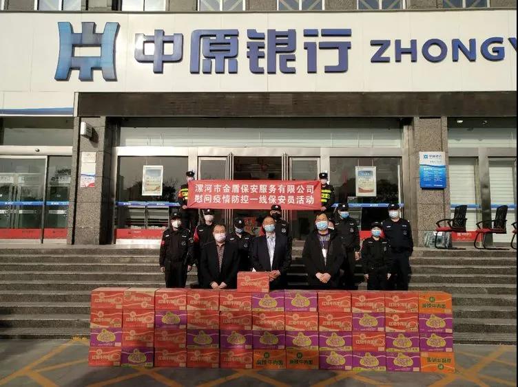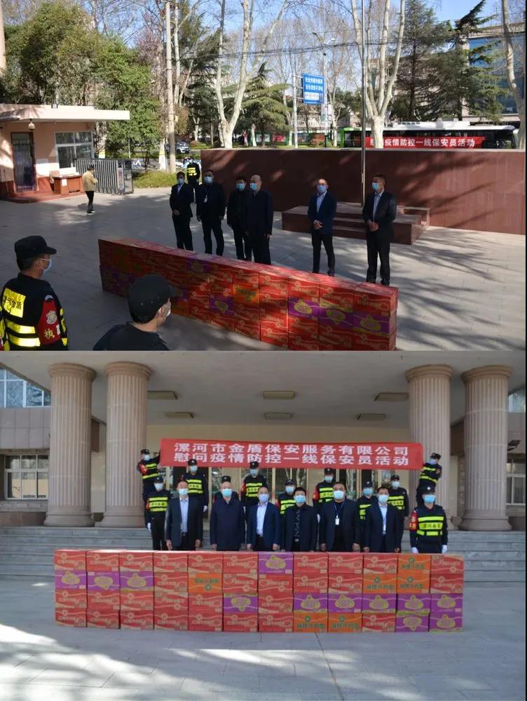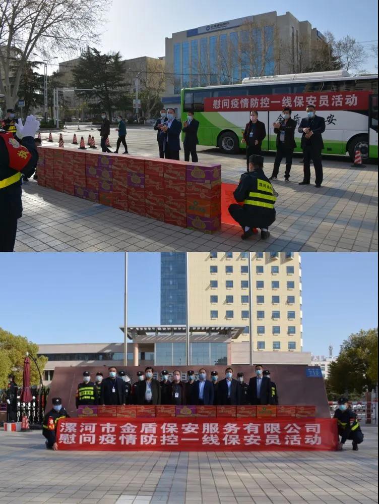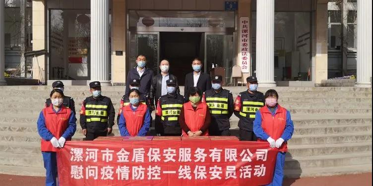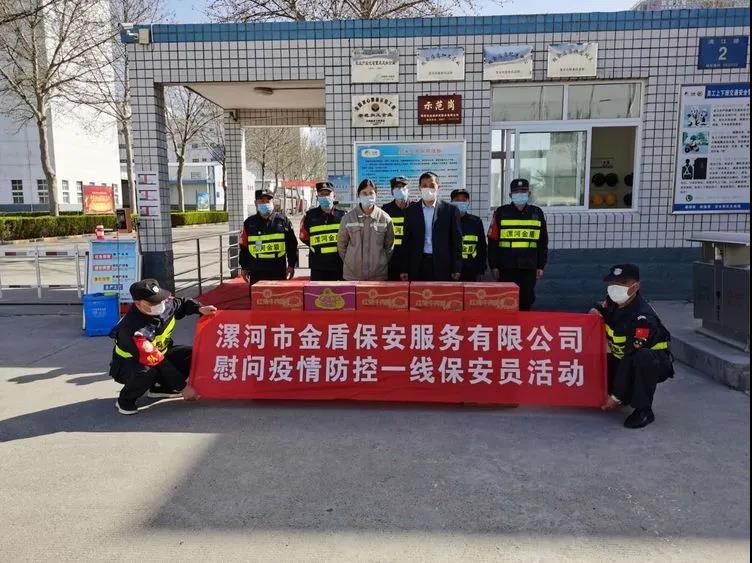 ▼源匯區(qū)機(jī)關(guān)事務(wù)服務(wù)中心綜合科科長(zhǎng)張娜與公司領(lǐng)導(dǎo)班子共同慰問堅(jiān)守在疫情防控一線的保安員代表。