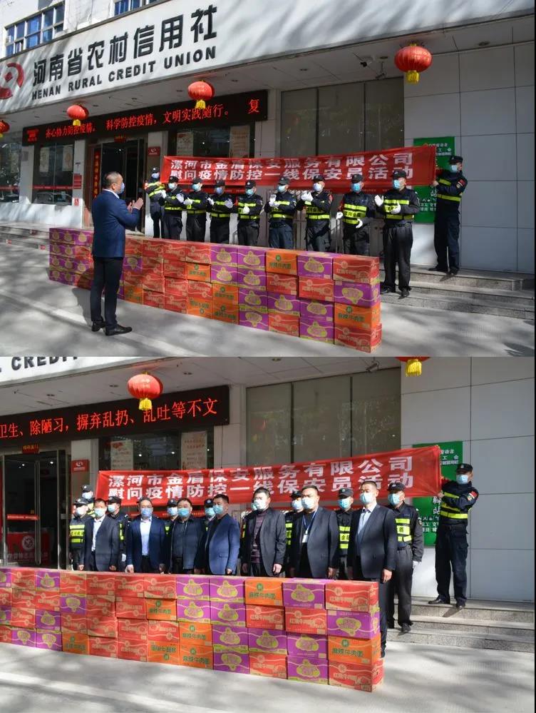 ▼郾城區(qū)農(nóng)村信用合作聯(lián)社副主任王宏建,保衛(wèi)科科長(zhǎng)安鵬超與公司領(lǐng)導(dǎo)班子共同慰問堅(jiān)守在疫情防控一線的保安員代表。