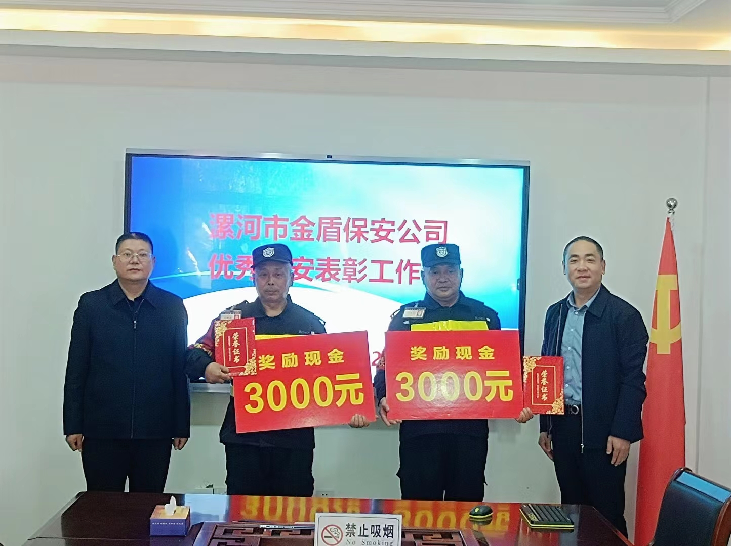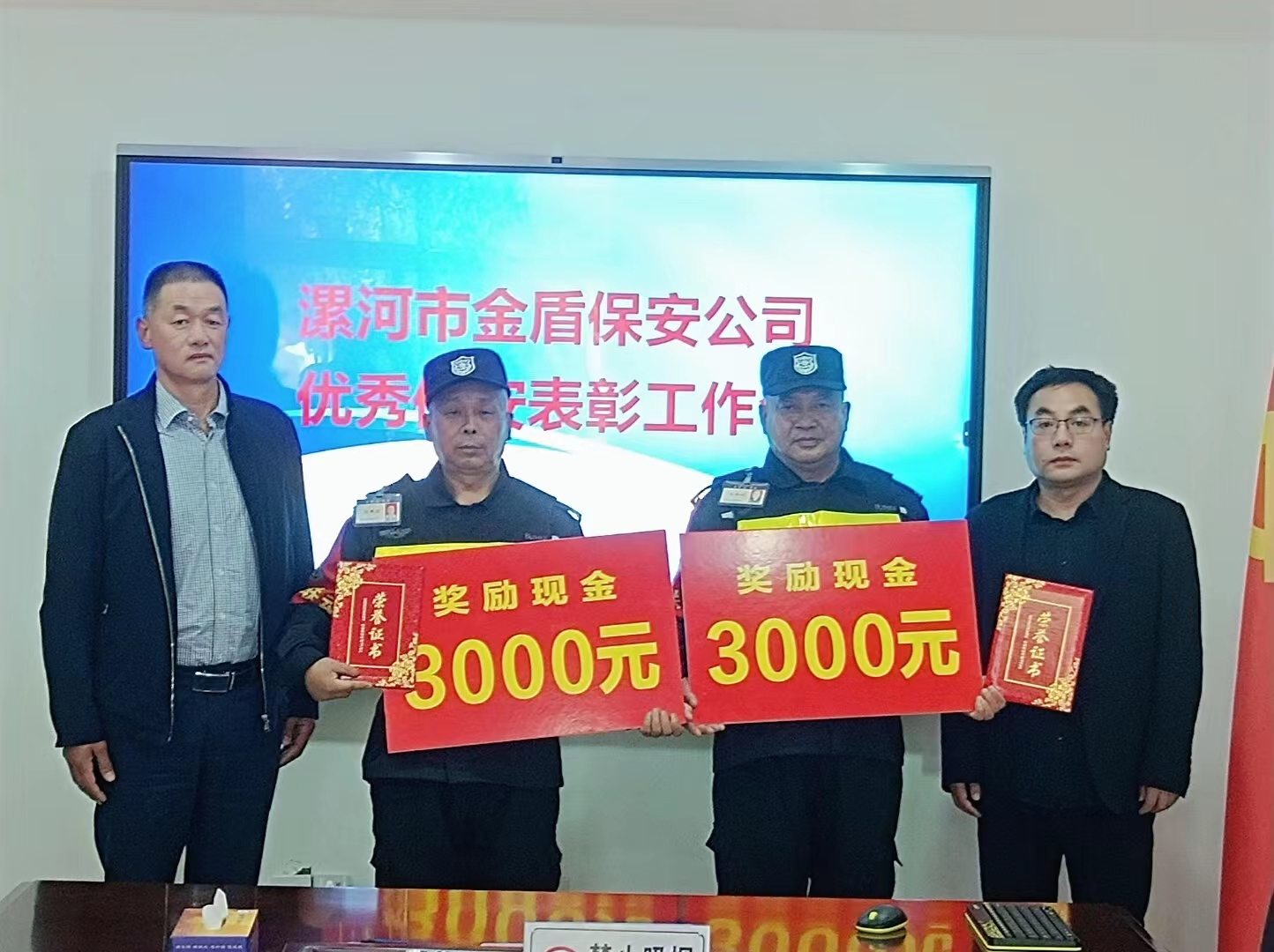2023年3月7日,漯河市金盾保安服務(wù)有限公司總經(jīng)理楊獻(xiàn)軍、副總經(jīng)理吳清旺、辦公室主任徐飛、源匯區(qū)二大隊大隊長劉秀金一行到漯河市第三初級中學(xué),協(xié)同漯河市第三初級中學(xué)黨委書記兼校長趙國強(qiáng)、副校長李東亮、總務(wù)副主任余海洋,共同對林四平、吳改順兩位同志進(jìn)行了表彰,每人頒發(fā)榮譽(yù)證書一個,每人現(xiàn)金獎勵3000元。